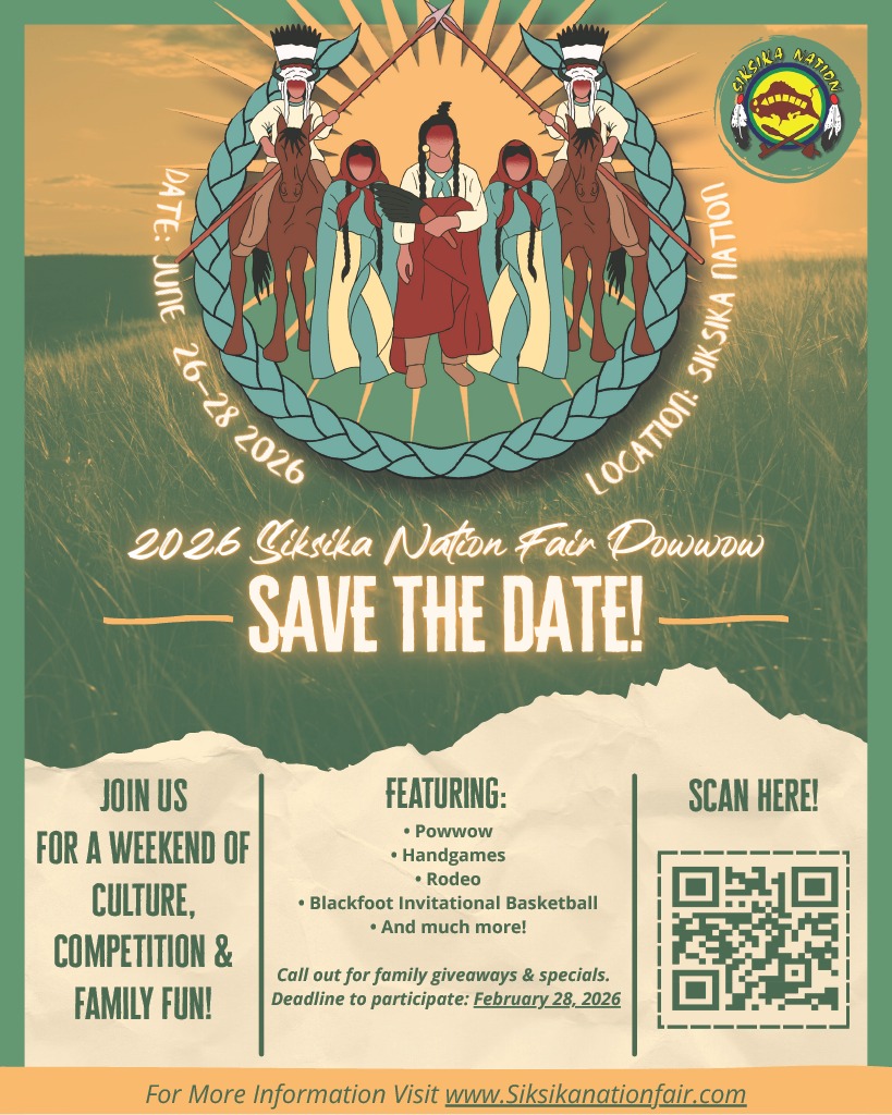 Siksika Nation Fair 2026 Siksika Nation June 26–28, 2026 Powwow • Handgames • Rodeo • Blackfoot Invitational Basketball • Baseball • & MORE! ***Powwow: Call for family giveaways and specials.…