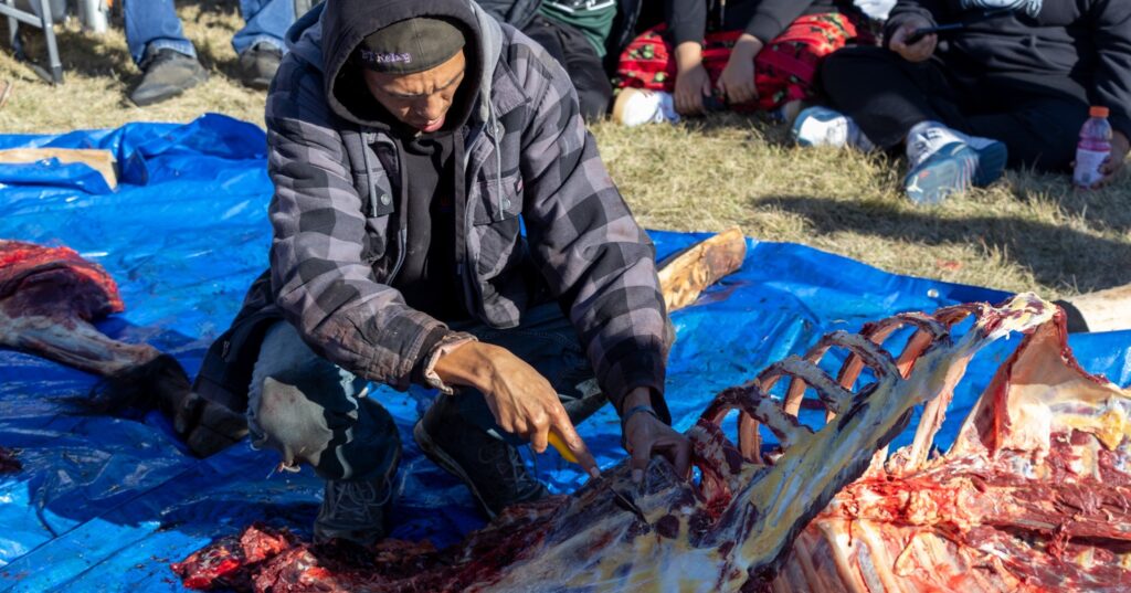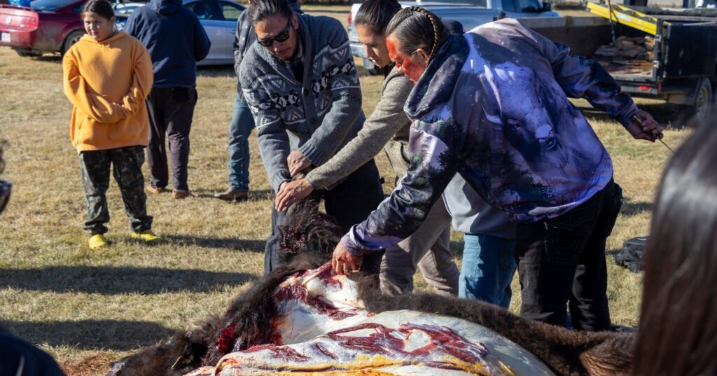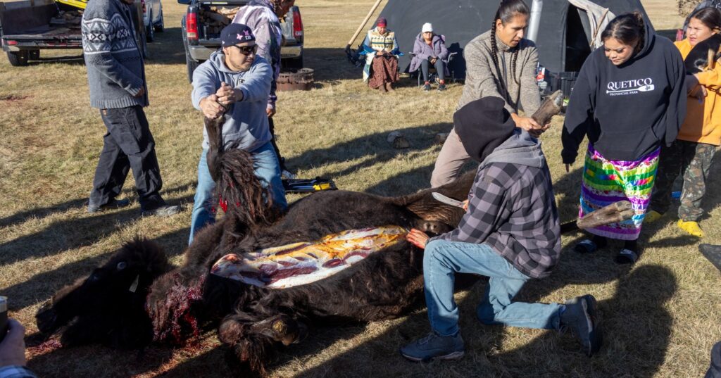 On October 22nd, 2025, the Siksikaipowahsin (Blackfoot Language Program) hosted a buffalo harvest in front of the Tribal Administration Building.