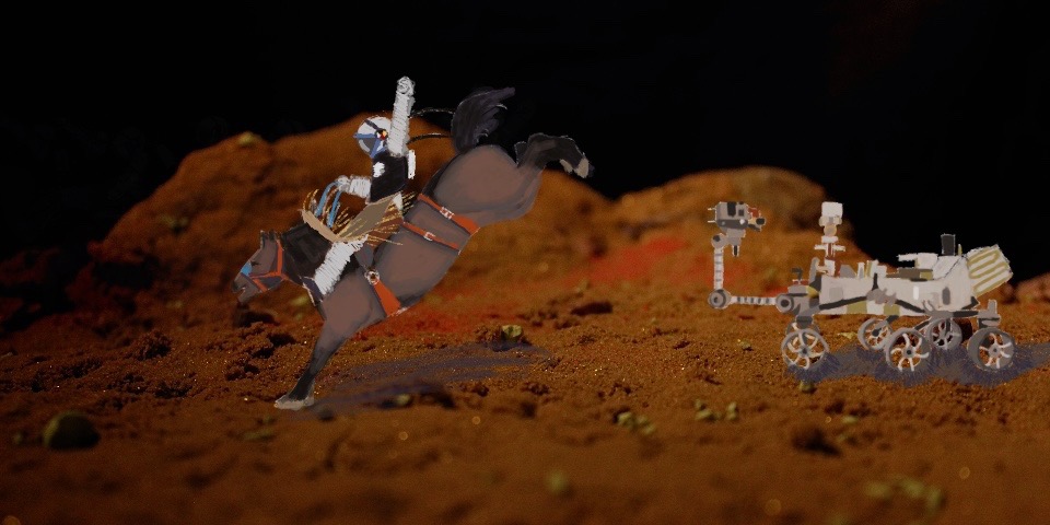 bronc riding into a Martian sunset. “This imagery reimagines the colonization of mars being